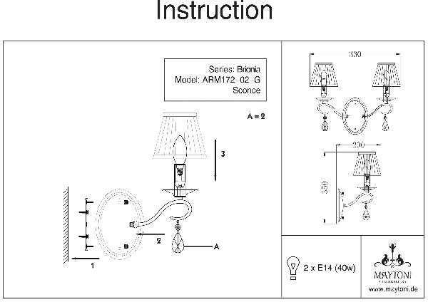 Осветительный прибор сделан в стиле Классический. Подходят лампочки с цоколем E14 мощностью 40W Вт, количеством 2 ед. Основной цвет модели ARM172-02-G: Белый.