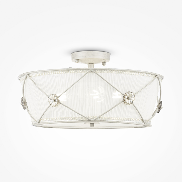 Объемный абажур светильника изготовлен из роскошного гофрированного текстиля нежно-лилового цвета. А когда зажигается свет, он приобретает еще более великолепный бежевый оттенок. Завершенности композиции добавляют оригинальные металлические вставки в форме великолепных цветов. Светильник крепится непосредственно под потолок, поэтому он гармонично подойдет для спальни с невысокими потолками.