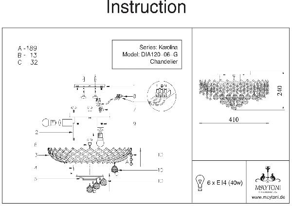 Осветительный прибор выполнен в стиле Классический. Используются лампочки с цоколем E27 мощностью 40W Вт, в количестве 6 шт. Основной цвет модели DIA120-06-G: Золотой.