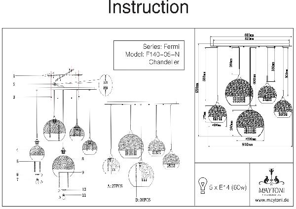 Осветительный прибор выполнен в стиле Хай-тек. Используются лампы с цоколем E14 мощностью 60W Вт, количеством 5 шт. Цвет модели P140-PL-170-5-N: Никель.