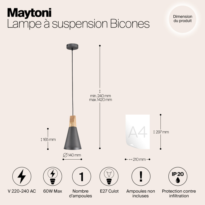Подвесной светильник P359-PL-140-C изготавливается брендом Maytoni из коллекции Pendant. Габариты: высота 165 мм, диаметр 140 мм. Светильники Maytoni P359-PL-140-C изготовлены с использованием высококачественных и прочных материалов, таких как: Металл,Дерево, плафон - Металл.