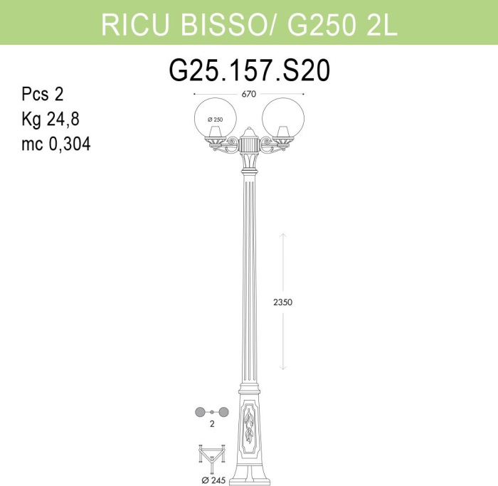 Уличный столб G25.157.S20.VZF1R производится брендом Fumagalli, которая относится к коллекции GLOBE 250. Размеры: высота 2350 мм, ширина 670 мм. Уличное освещение Fumagalli G25.157.S20.VZF1R произведены из высококачественных и прочных материалов, таких как: Пластиковые,Полимер, плафон - Пластиковые,Полиметилметакрилат.