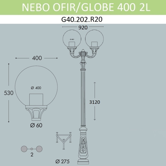 Осветительный прибор разработан в стиле Классический. Используются лампы с цоколем E27 мощностью 200 Вт, в количестве 2 ед. Цвет модели G40.202.R20.AYE27: Чёрный.