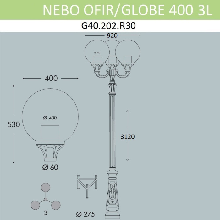 Осветительный прибор выполнен в стиле Классический. Задействуются лампы с цоколем E27 мощностью 300 Вт, количеством 3 шт. Цвет модели G40.202.R30.AYE27: Чёрный.