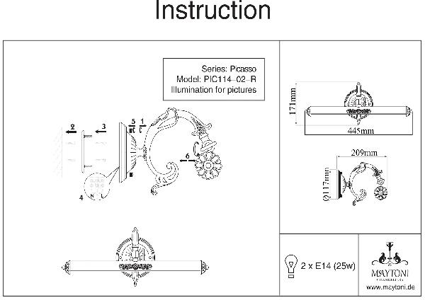 Осветительный прибор сделан в стиле Классический. Задействуются лампочки с цоколем E14 мощностью 50 Вт, количеством 2 ед. Основной цвет модели PIC114-02-R: Бронза.