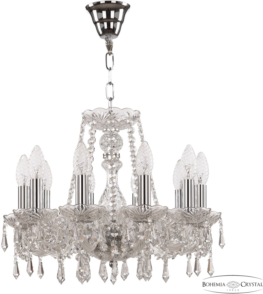Величественная 10-рожковая люстра с никелированными элементами и хрустальными подвесами.