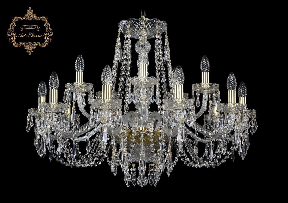 Осветительный прибор разработан в стиле Барокко. Задействуются лампы с цоколем E14 мощностью 600 Вт, в количестве 15 ед. Цвет модели 11.23.10+5.300.Gd.Dr: Прозрачный.