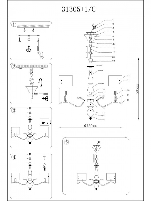 Применяются лампы с цоколем E14 мощностью 360 Вт, количеством 6 шт. Цвет модели 31305+1/C: Бежевый.