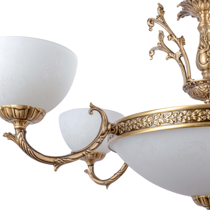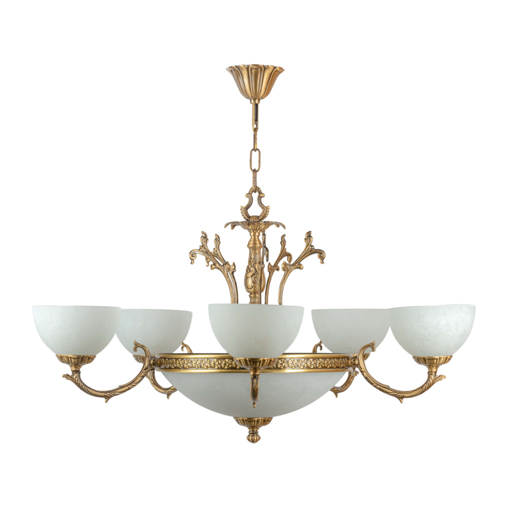 Осветительный прибор выполнен в стиле Ампир. Применяются лампочки цоколя E27 мощностью 300 Вт, количеством 10 шт.