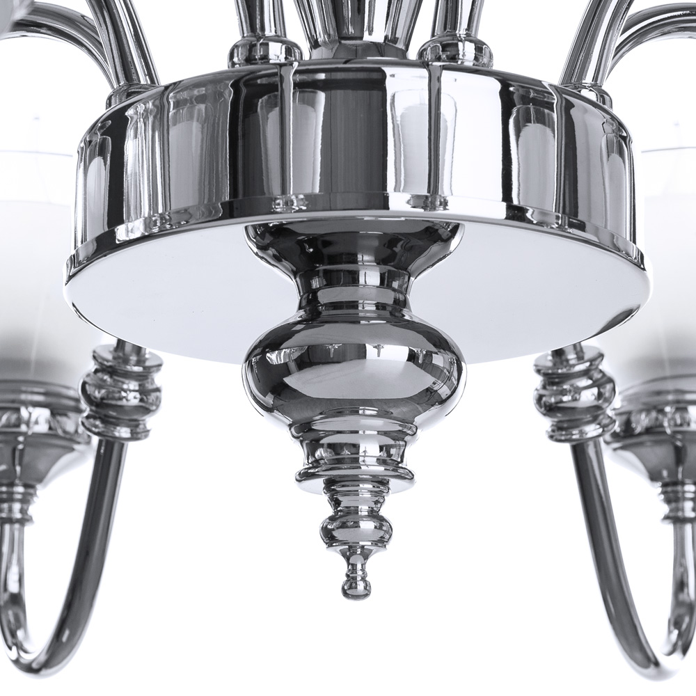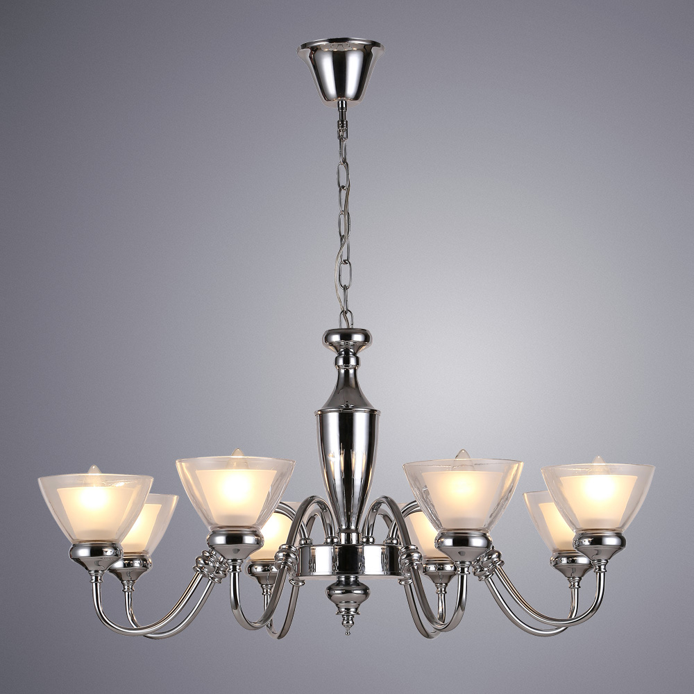Осветительный прибор выполнен в стиле Замковый. Задействуются лампы цоколя E14 мощностью 320 Вт, в количестве 8 шт. Основной цвет модели A5184LM-8CC: Хром.