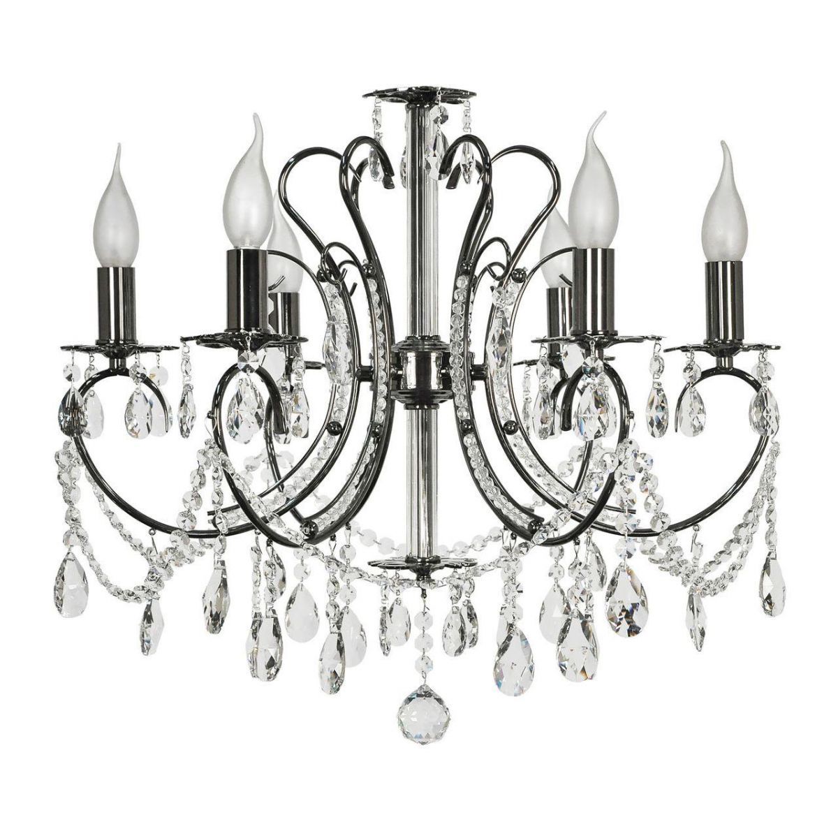 Осветительный прибор выполнен в стиле Барокко. Задействуются лампочки с цоколем E14 мощностью 240 Вт, в количестве 6 шт. Основной цвет модели Romano E 1.1.6.601 NB: Чёрный.