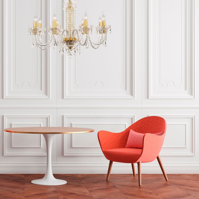 Осветительный прибор сделан в стиле Барокко. Используются лампочки с цоколем E14 мощностью 320 Вт, количеством 8 ед. Основной цвет модели Sofia E 1.1.8.600 G: Золотой.