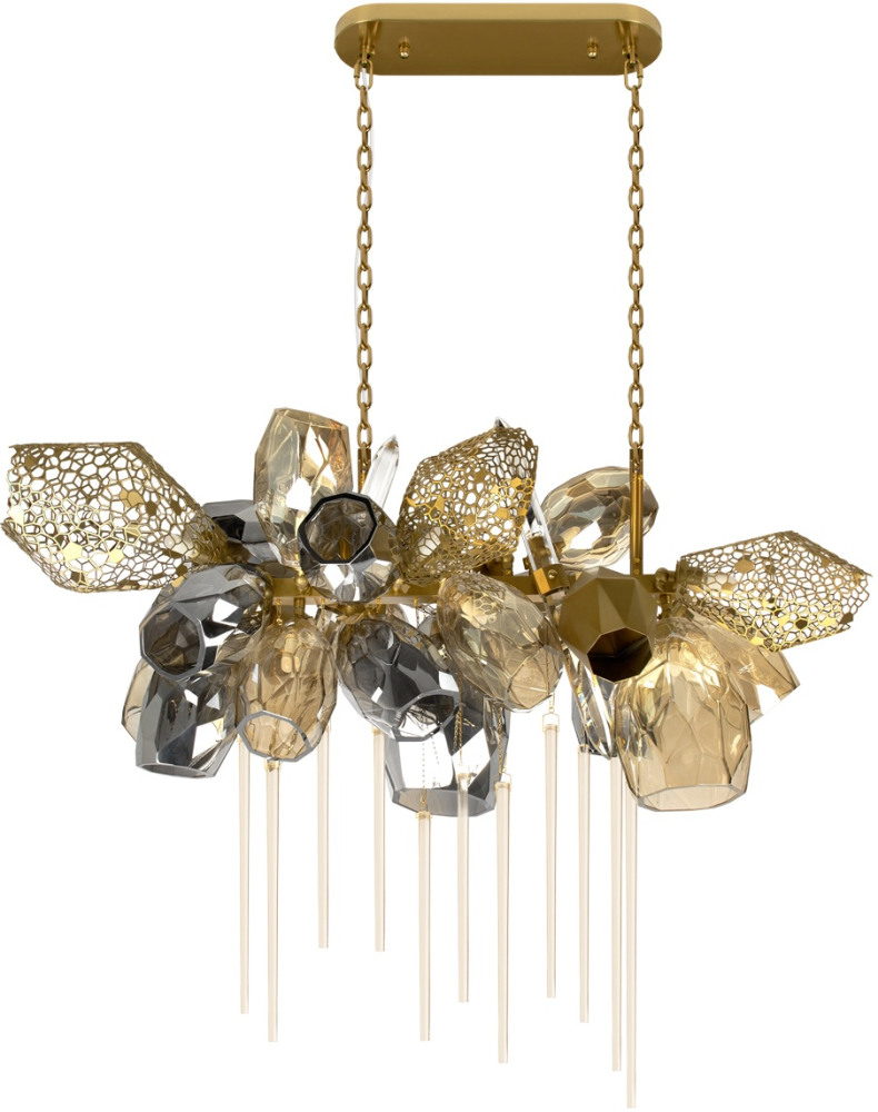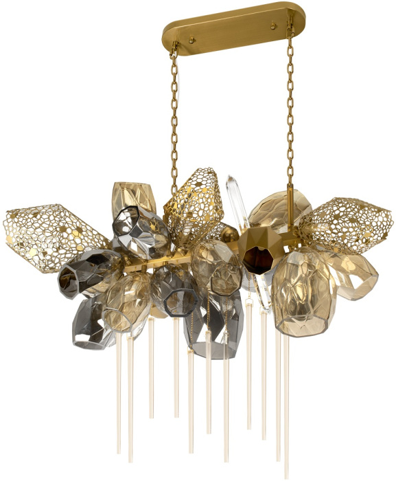 Осветительный прибор создан в стиле Арт-Деко. Задействуются лампочки цоколя G9 мощностью 110 Вт, количеством 22 шт. Цвет модели 10401/1000L: Прозрачный,Серый,Янтарный.
