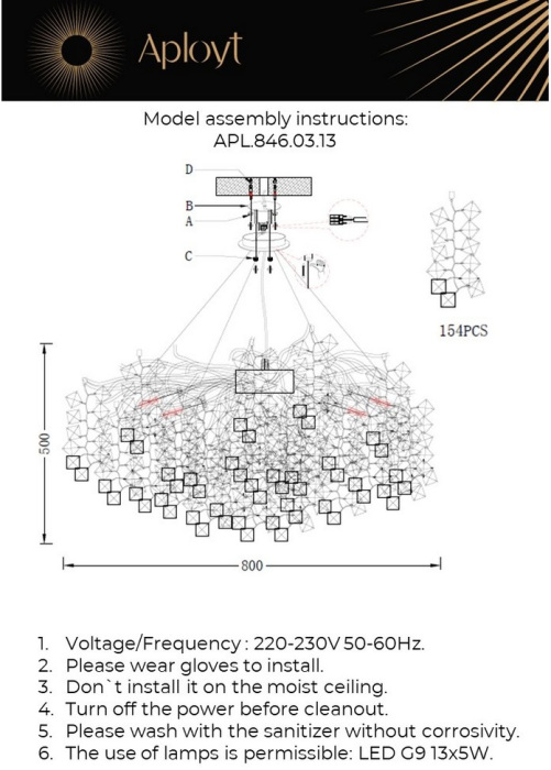 Осветительный прибор создан в стиле Арт-Деко. Используются лампы с цоколем G9 мощностью 65 Вт, в количестве 13 ед. Цвет модели APL.846.03.13: Прозрачный.