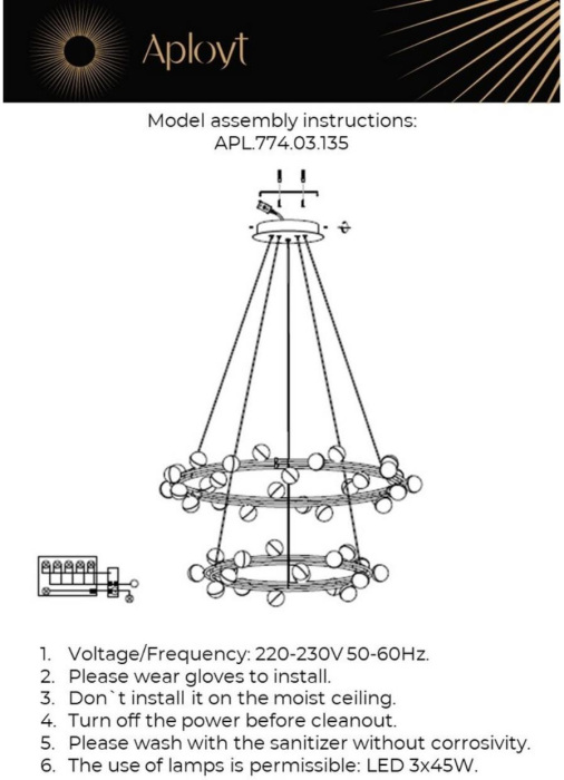 Осветительный прибор разработан в стиле Модерн. Используются лампы цоколя LED мощностью 135 Вт, в количестве 45 шт. Основной цвет модели APL.774.03.135: Золотой,Прозрачный.