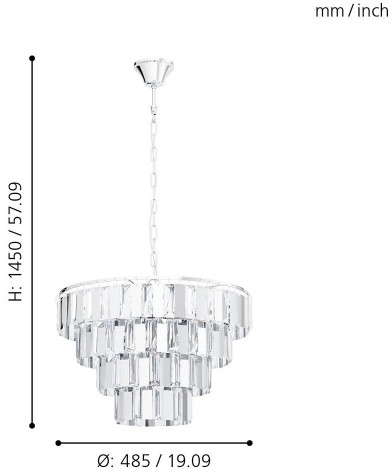 99094 производится брендом Eglo из коллекции Erseka. Габаритные размеры: высота 1450 мм, диаметр 485 мм. Люстры Eglo 99094 произведены из высококачественных и прочных материалов: металл, плафон - хрусталь.