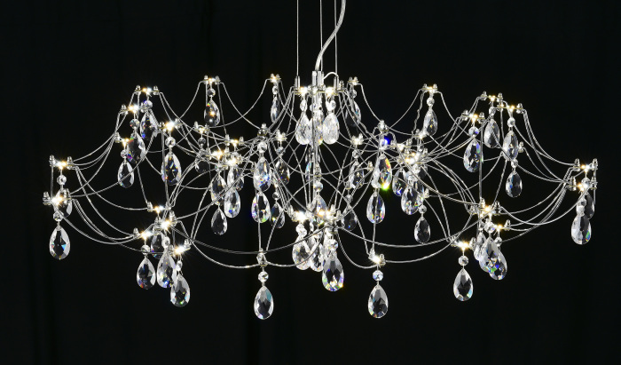 Осветительный прибор создан в стиле Арт-Деко. Применяются лампы с цоколем LED мощностью 30 Вт, количеством 60 шт.
