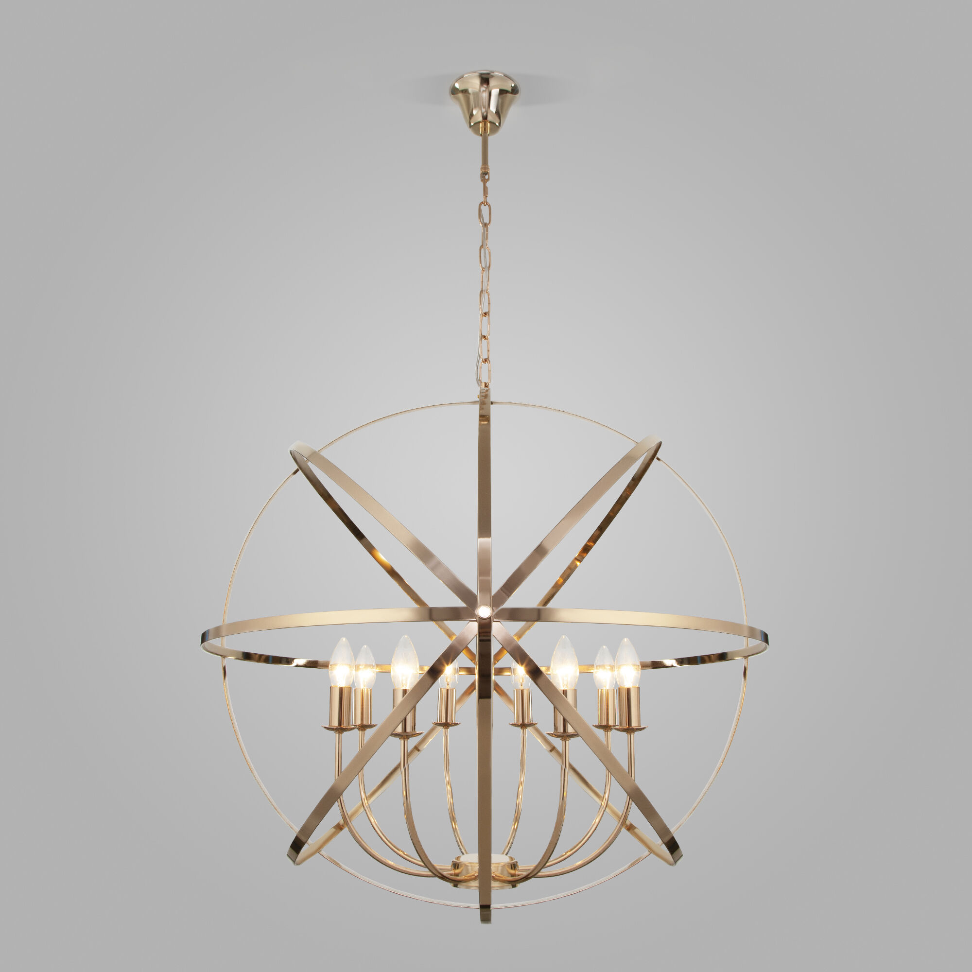 Осветительный прибор выполнен в стиле Дизайнерский. Применяются лампочки с цоколем E14 мощностью 40 Вт, в количестве 8 шт. Основной цвет модели a058342: Золотой.