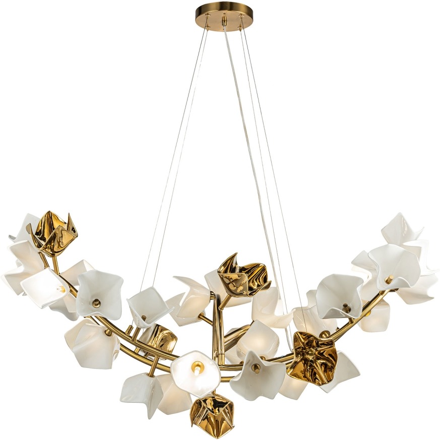 Осветительный прибор сделан в стиле Флористический. Используются лампы с цоколем G4 мощностью 70 Вт, в количестве 14 ед. Цвет модели LSP-8908: Белый,Золотой.