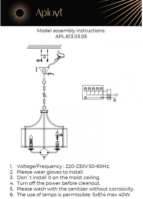 Осветительный прибор сделан в стиле Классический. Применяются лампочки с цоколем E14 мощностью 200 Вт, количеством 5 ед.