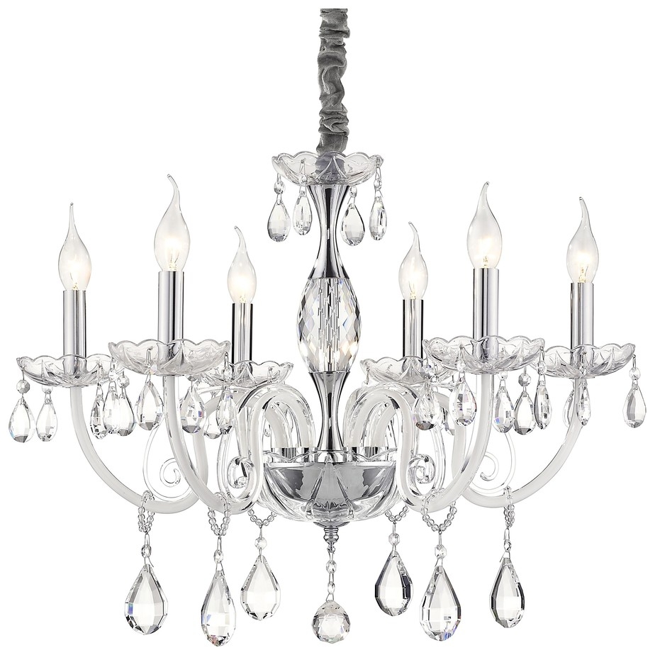Осветительный прибор разработан в стиле Классический. Используются лампочки с цоколем E14 мощностью 240 Вт, в количестве 6 шт. Основной цвет модели WE171.06.103: Прозрачный,Хром.
