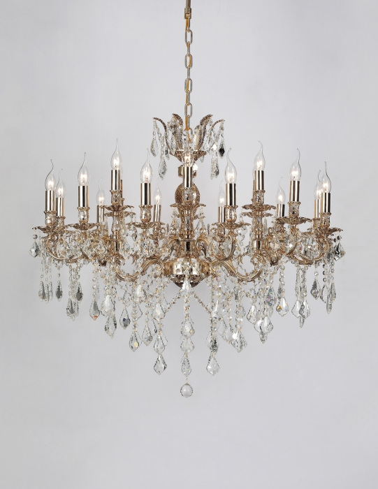 Осветительный прибор создан в стиле Барокко. Задействуются лампы цоколя E14 мощностью 1 080 Вт, в количестве 18 шт. Основной цвет модели Barletta 122.12.6 Coffe Gold: Золотой.
