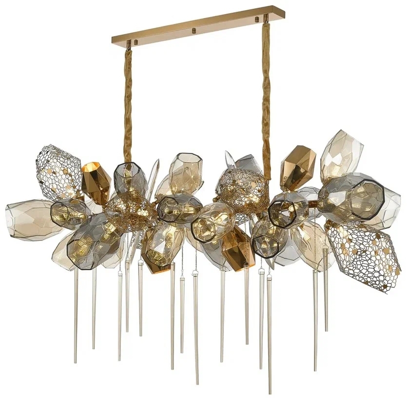 Осветительный прибор сделан в стиле Арт-Деко. Применяются лампы с цоколем G9 мощностью 1400 Вт, в количестве 35 ед. Цвет модели WE243.35.523: Прозрачный,Серый,Янтарный.