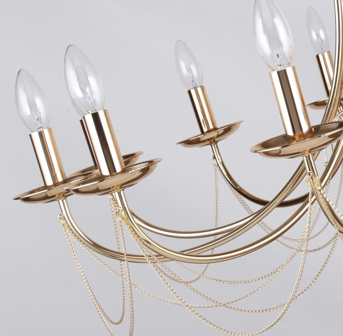 Осветительный прибор разработан в стиле Кантри. Используются лампы с цоколем E14 мощностью 480 Вт, количеством 12 шт. Цвет модели 2591-12P: Золотой.