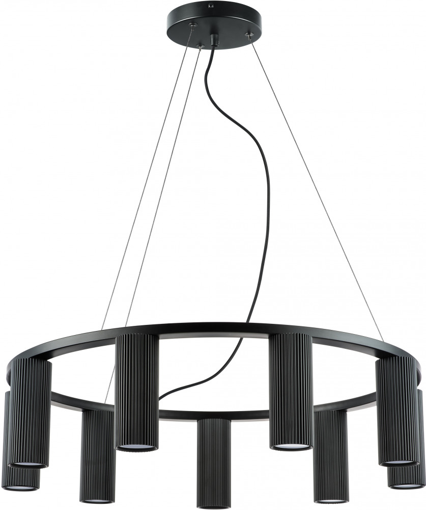 Осветительный прибор сделан в стиле Арт-Деко. Используются лампочки цоколя GU10 мощностью 252 Вт, в количестве 9 ед. Цвет модели 718097: Чёрный.