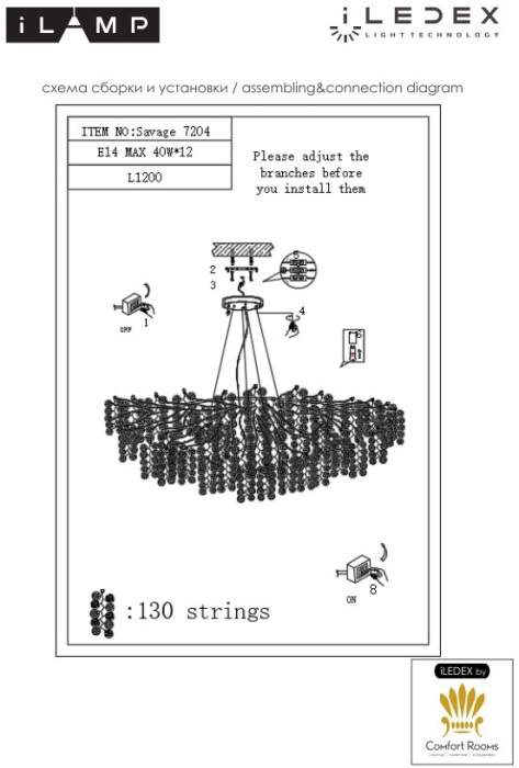 Осветительный прибор сделан в стиле Арт-Деко. Подходят лампочки цоколя E14 мощностью 480 Вт, в количестве 12 ед. Цвет модели 7204-L1200 GD: Белый.