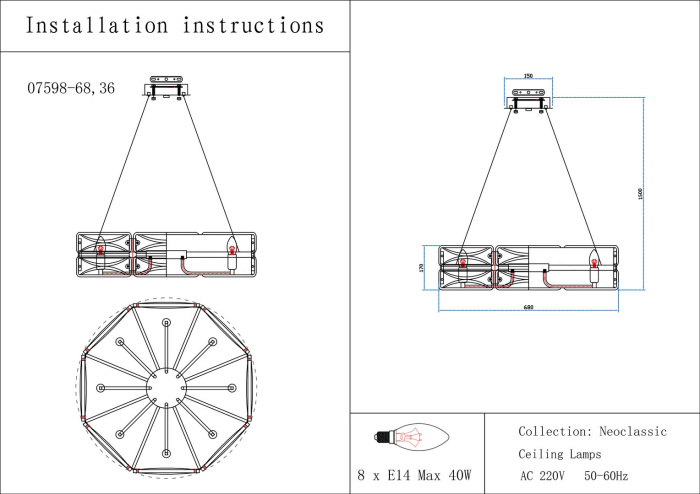 Осветительный прибор создан в стиле Модерн. Подходят лампы цоколя E14 мощностью 320 Вт, количеством 8 ед.