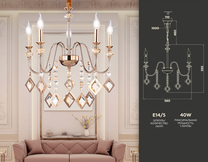 Осветительный прибор сделан в стиле Классический. Задействуются лампы с цоколем E14 мощностью 200 Вт, в количестве 5 ед. Цвет модели TR4955: Прозрачный.