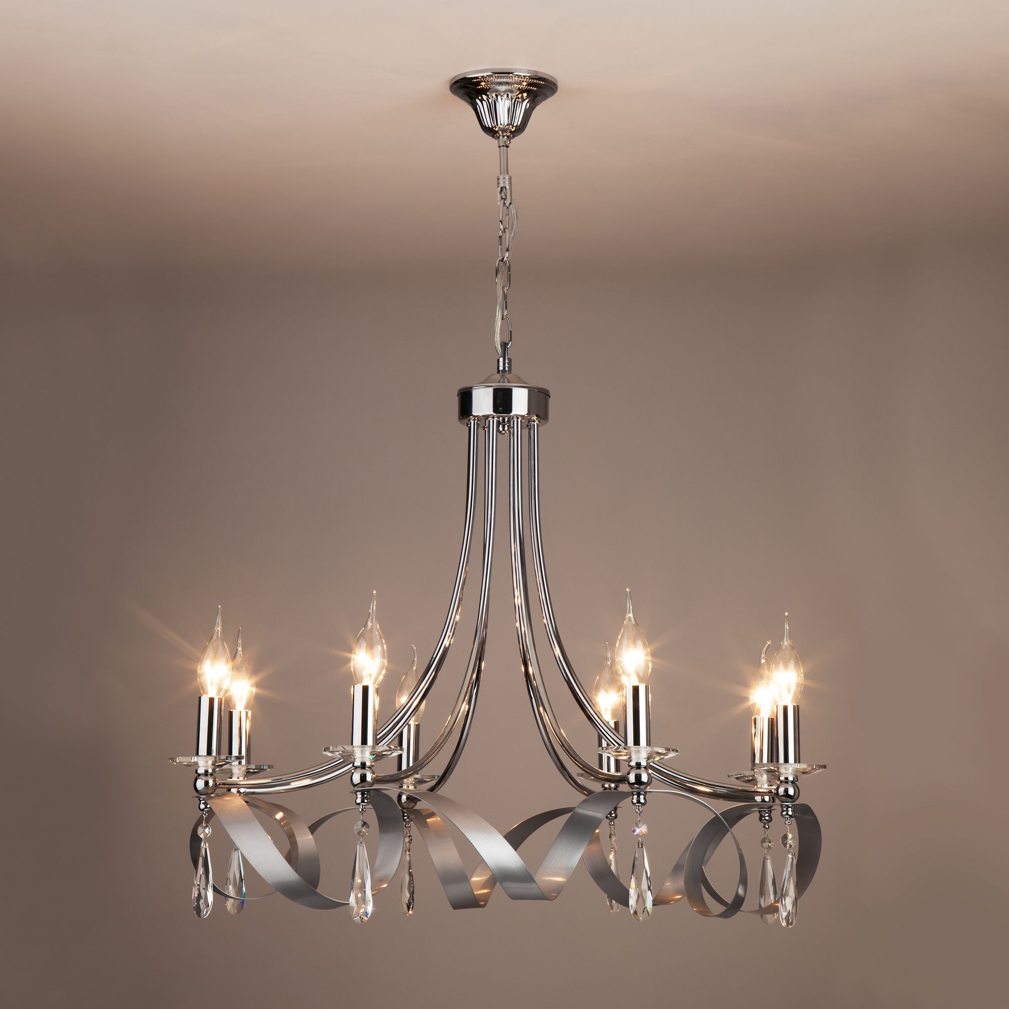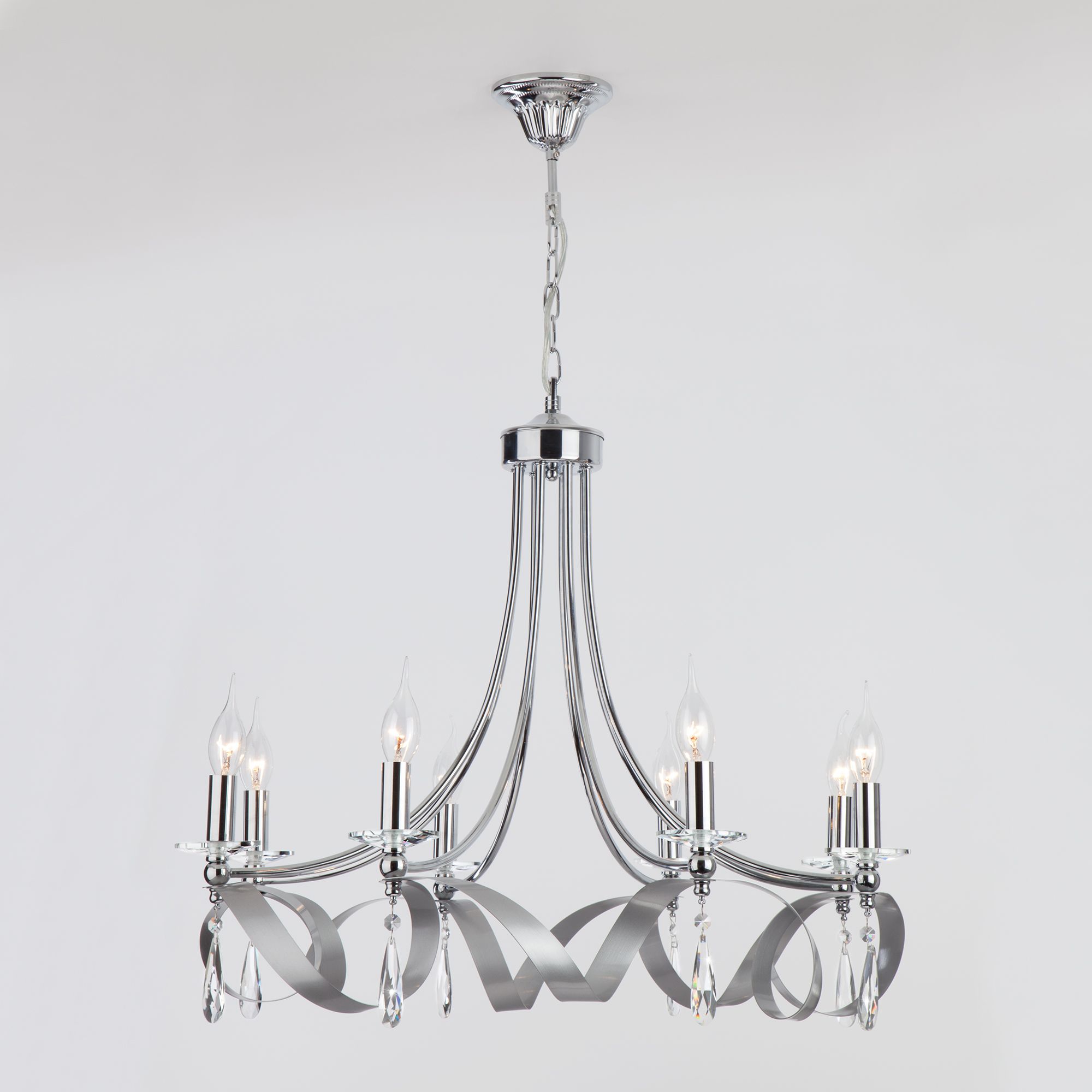 Осветительный прибор сделан в стиле Арт-Деко. Задействуются лампочки цоколя E14 мощностью 60 Вт, в количестве 8 ед. Цвет модели 00000082091: Хром.