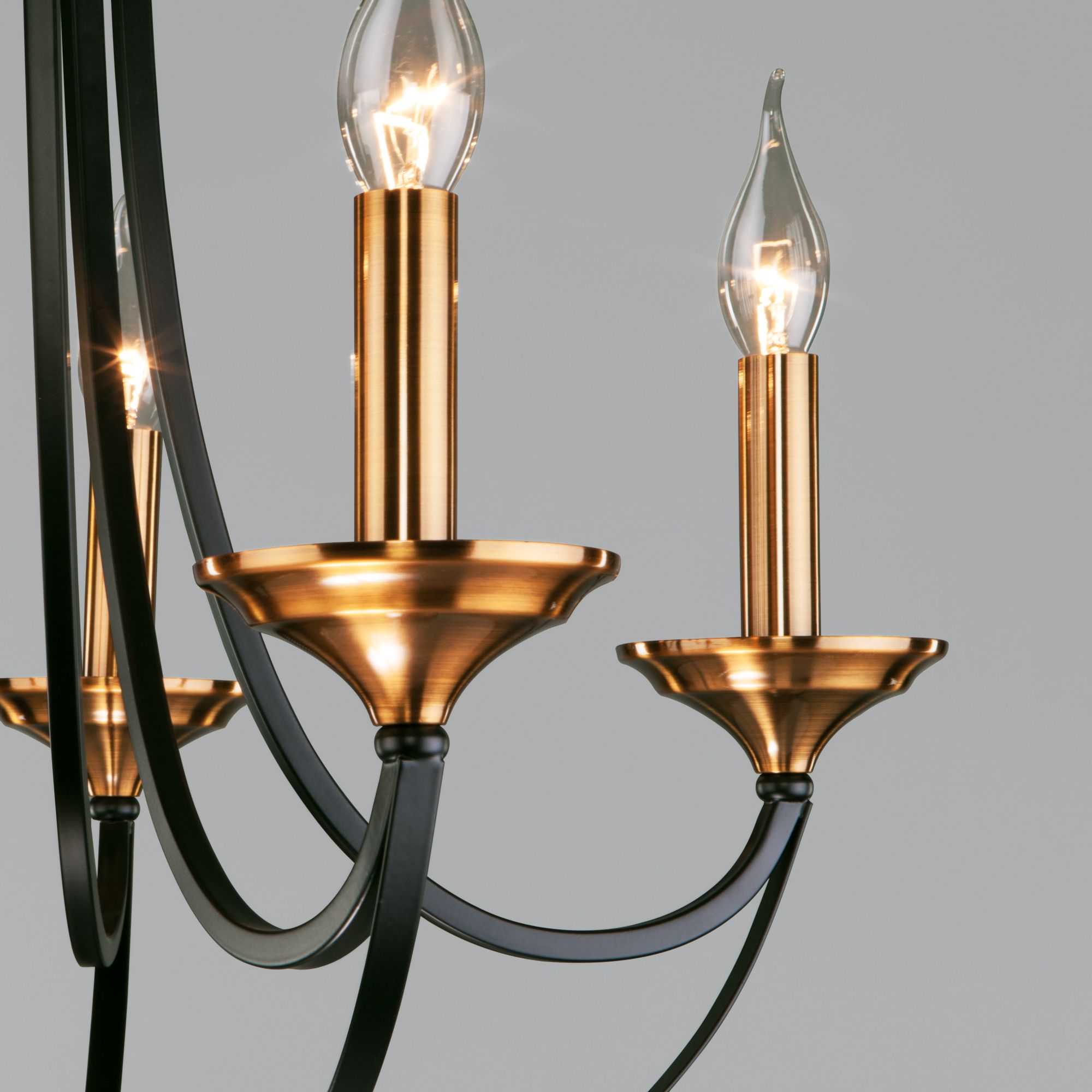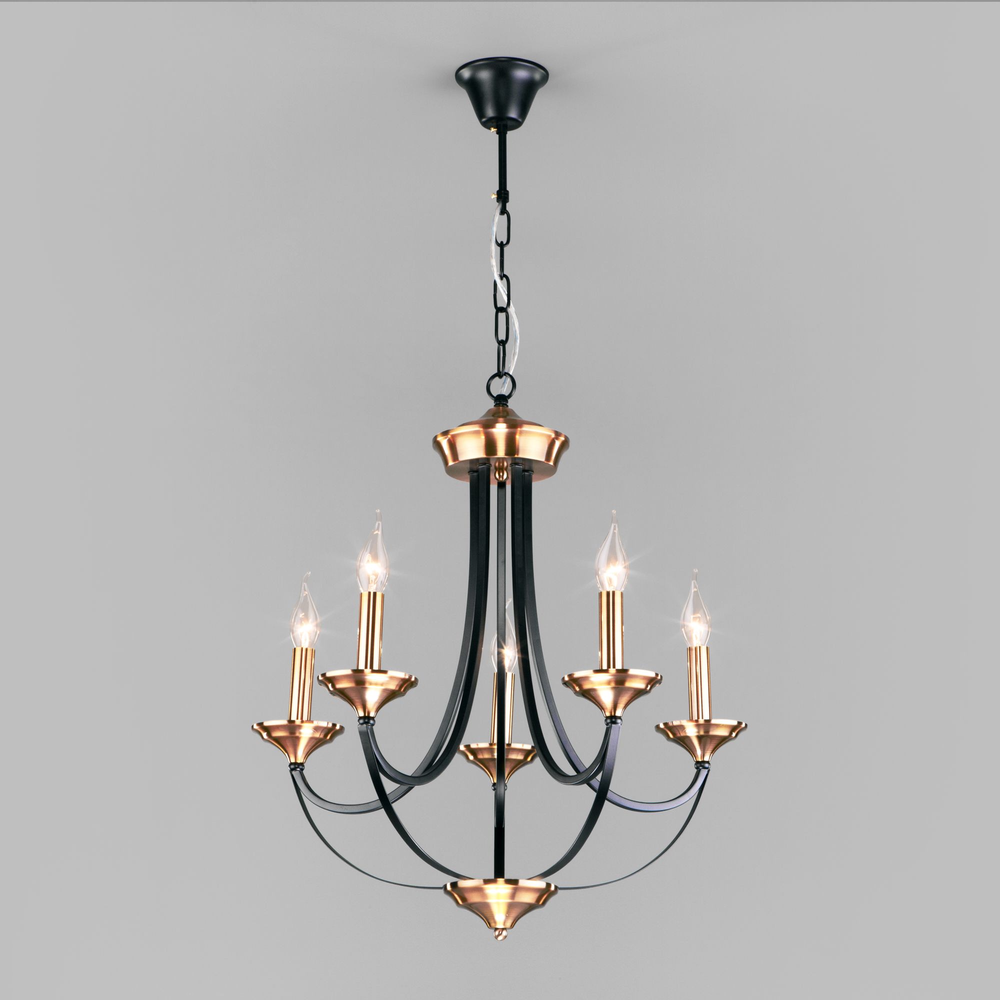 Осветительный прибор создан в стиле Готика. Задействуются лампы с цоколем E14 мощностью 60 Вт, количеством 5 шт. Цвет модели a045210: Чёрный.
