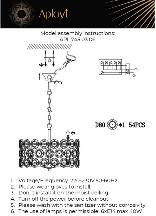 Осветительный прибор выполнен в стиле Модерн. Применяются лампочки с цоколем E14 мощностью 240 Вт, в количестве 6 шт. Основной цвет модели APL.745.03.06: Прозрачный,Серый.