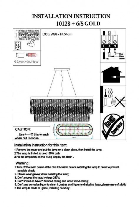 Осветительный прибор разработан в стиле Классический. Задействуются лампочки с цоколем G9 мощностью 560 Вт, количеством 14 ед. Основной цвет модели 10128+6/S gold: Прозрачный.