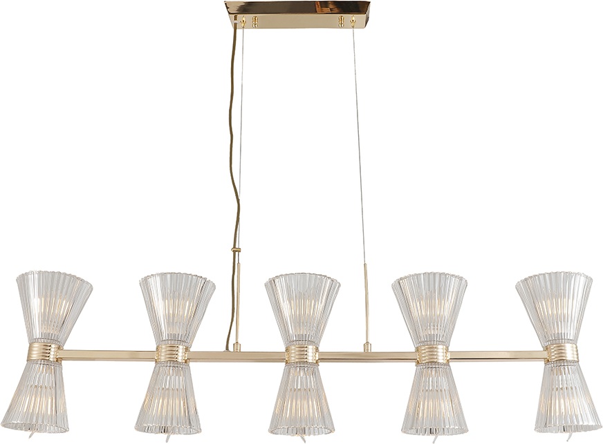 Осветительный прибор разработан в стиле Модерн. Используются лампы цоколя E14 мощностью 400 Вт, количеством 10 ед. Основной цвет модели 3615/S gold new: Прозрачный.