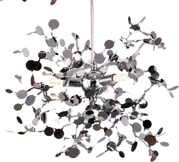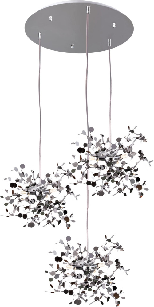 Осветительный прибор разработан в стиле Арт-Деко. Задействуются лампы с цоколем G9 мощностью 45 Вт, в количестве 9 ед. Цвет модели L3PR721134: Хром.