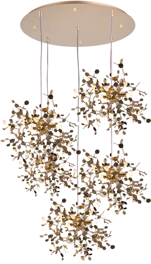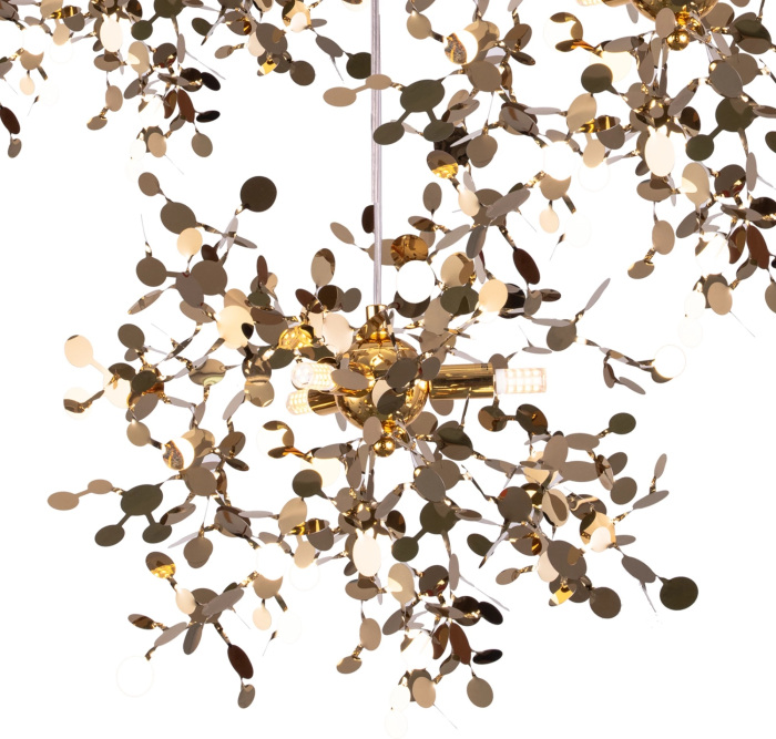 Осветительный прибор разработан в стиле Арт-Деко. Задействуются лампы с цоколем G9 мощностью 75 Вт, в количестве 15 ед. Цвет модели L5PR721132: Золотой.