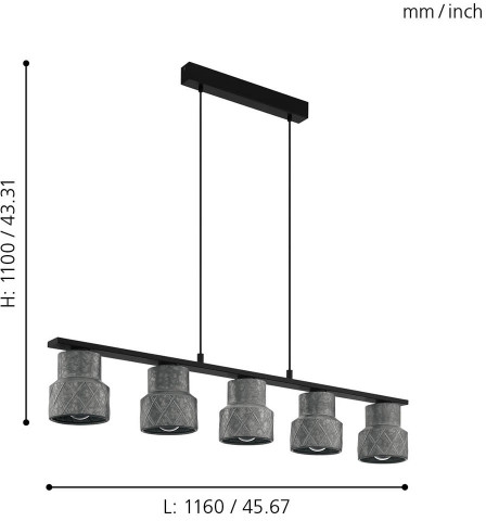 Подвесной светильник 39855 изготавливается брендом Eglo, относящаяся к коллекции Hilcott. Размеры: длина 1160 мм, высота 1100 мм, ширина 145 мм. Светильники Eglo 39855 изготовлены с использованием высококачественных и прочных материалов, таких как: металл, плафон - Металл.
