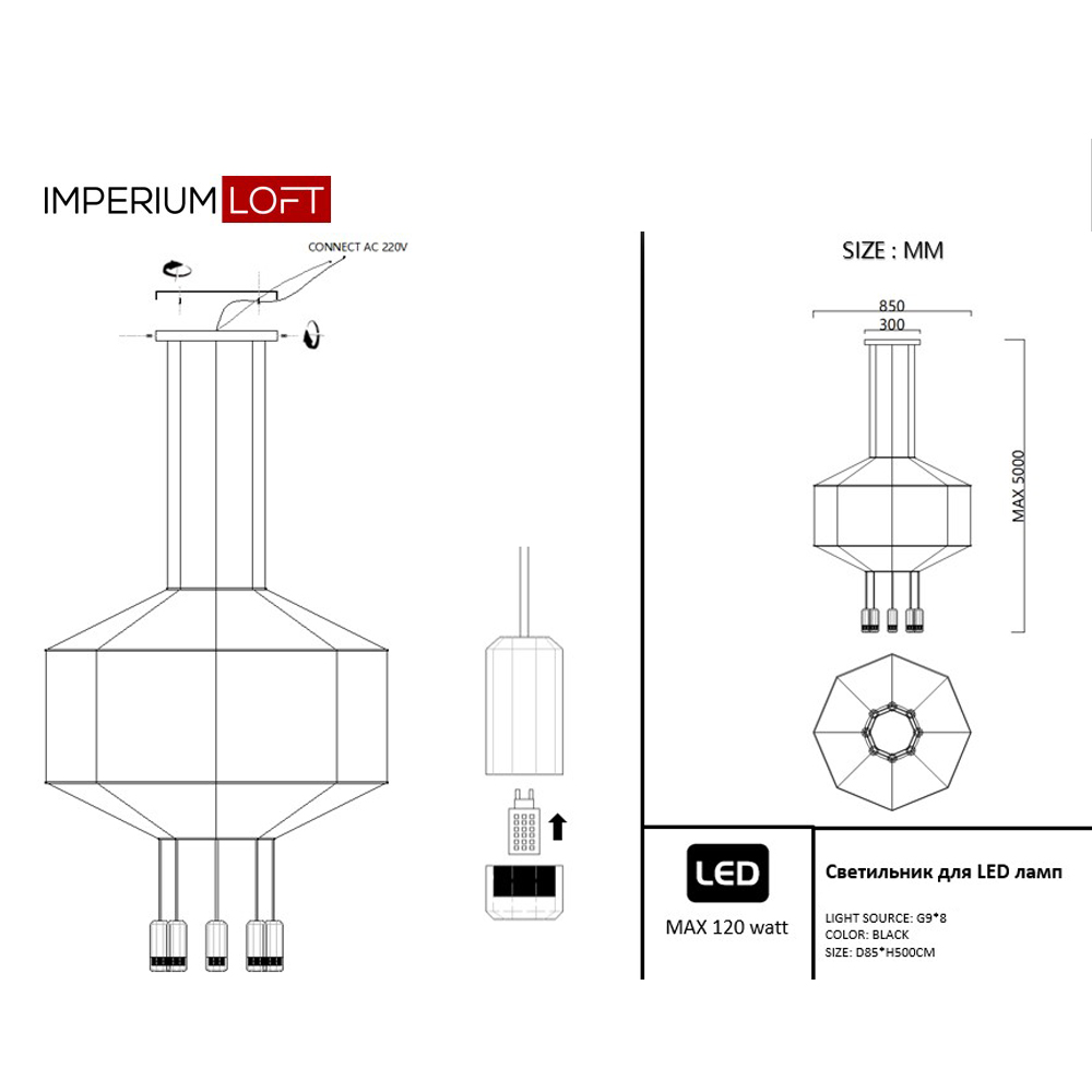 Осветительный прибор разработан в стиле Конструктивизм. Задействуются лампы с цоколем G9 мощностью 320 Вт. Цвет модели 84534-22: Чёрный.