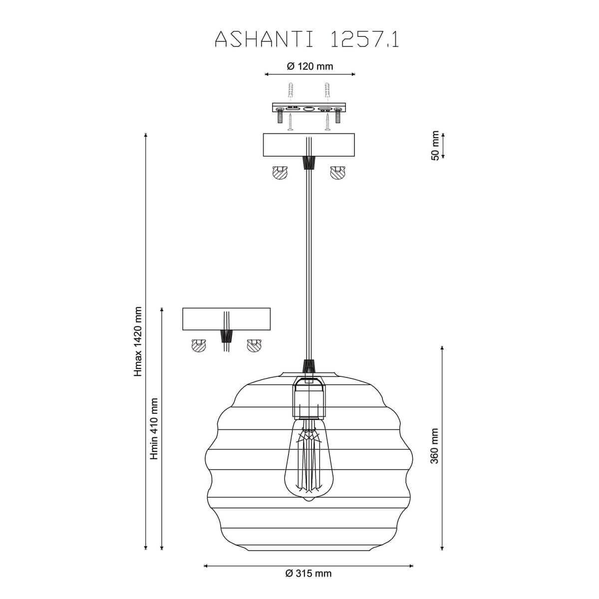 Осветительный прибор сделан в стиле Ретро. Подходят лампочки с цоколем E27 мощностью 40 Вт, количеством 1 ед. Основной цвет модели Ashanti 1257.1: Чёрный.