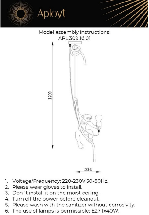 Осветительный прибор создан в стиле Модерн. Применяются лампы цоколя E27 мощностью 40 Вт, в количестве 1 шт.