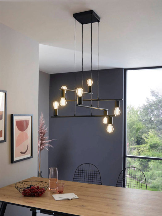 Осветительный прибор создан в стиле Минимализм. Применяются лампочки с цоколем E27 мощностью 320 Вт, в количестве 8 шт. Основной цвет модели 98909: Чёрный.