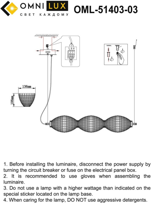 Подвесной светильник OML-51403-03 производится брендом Omnilux, которая относится к коллекции Paglio. Габариты: длина 730 мм, высота 1120 мм, ширина 135 мм. Светильники Omnilux OML-51403-03 произведены из высококачественных и прочных материалов: металл, плафон - стекло.