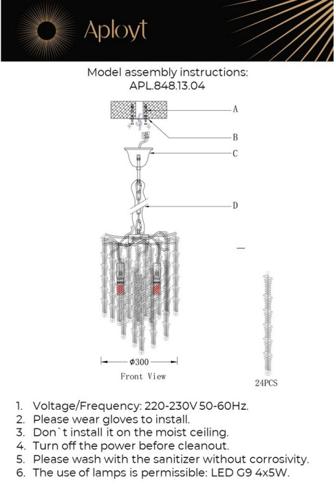 Осветительный прибор создан в стиле Арт-Деко. Подходят лампочки с цоколем G9 мощностью 20 Вт, количеством 4 ед. Основной цвет модели APL.848.13.04: Прозрачный.