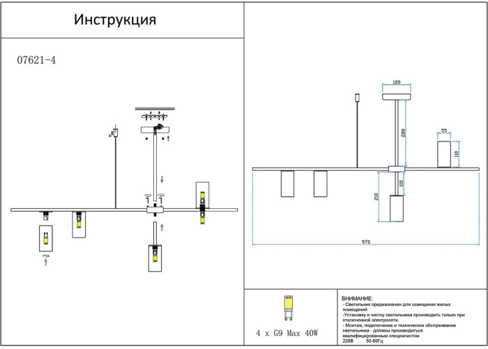 Подходят лампочки цоколя GU10 мощностью 40 Вт, в количестве 4 ед. Цвет модели 07621-4,19: Чёрный.