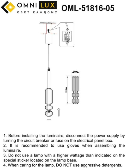 Подвесной светильник OML-51816-05 производится брендом Omnilux из коллекции Vepri. Габариты: высота 1540 мм, диаметр 80 мм. Светильники Omnilux OML-51816-05 созданы с применением высококачественных и прочных материалов, таких как: металл, плафон - стекло.