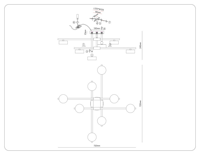 Осветительный прибор выполнен в стиле Минимализм. Применяются лампочки с цоколем GX53 мощностью 96 Вт, в количестве 8 шт.