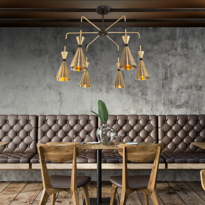 Осветительный прибор создан в стиле Джапанди. Задействуются лампы с цоколем E14 мощностью 360 Вт, количеством 6 шт. Цвет модели 316/6: Латунь.